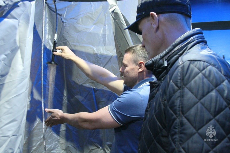 Еще одним из объектов стал комплекс специальной обработки населения. Этот универсальный комплекс мобилен и автономен, может быть установлен в любом месте за пределами зоны ЧС. Позволяет обрабатывать население от заражения как в летнее, так и в зимнее время – комплекс рассчитан на температурный диапазон от минус 40 до плюс 40 градусов. Пропускная способность комплекса - 200 человек в час. Вода для помывки населения подается из пожарной автоцистерны, что позволяет не быть зависимым от стационарных источников водоснабжения.