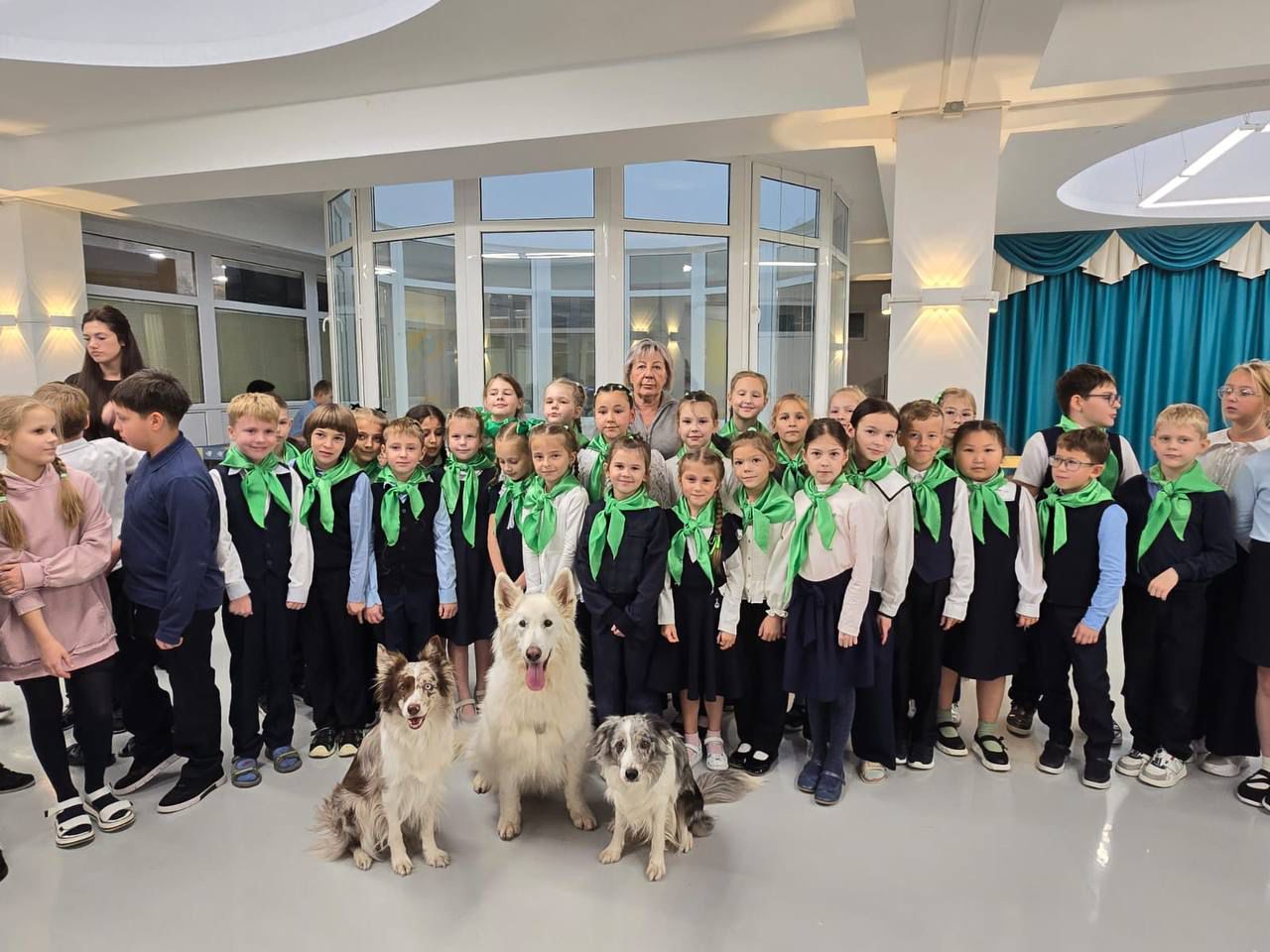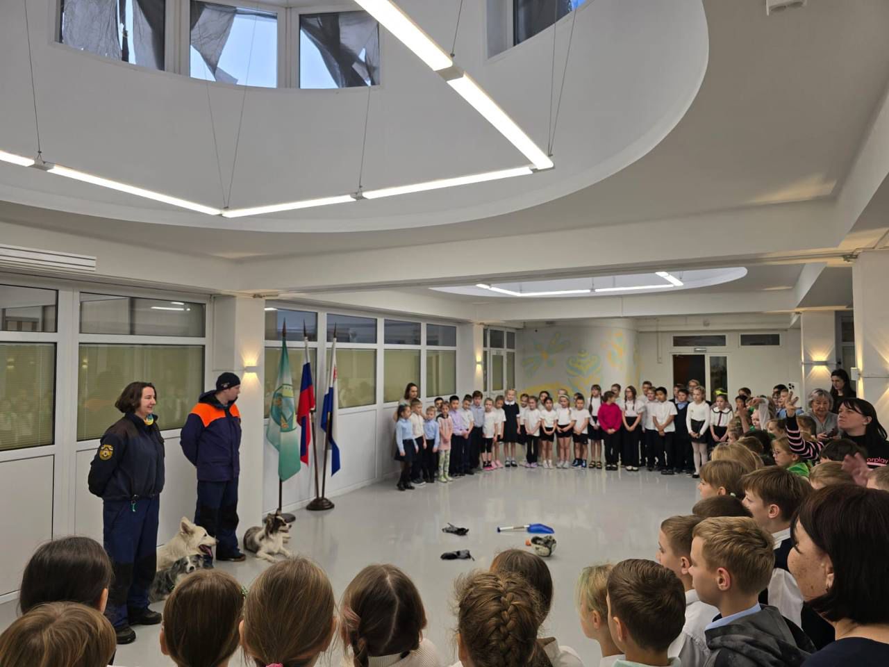 Сотрудники ведомства приехали туда со своими питомцами, собаками-спасателями, чтобы рассказать воспитанникам начальных классов о своей работе.