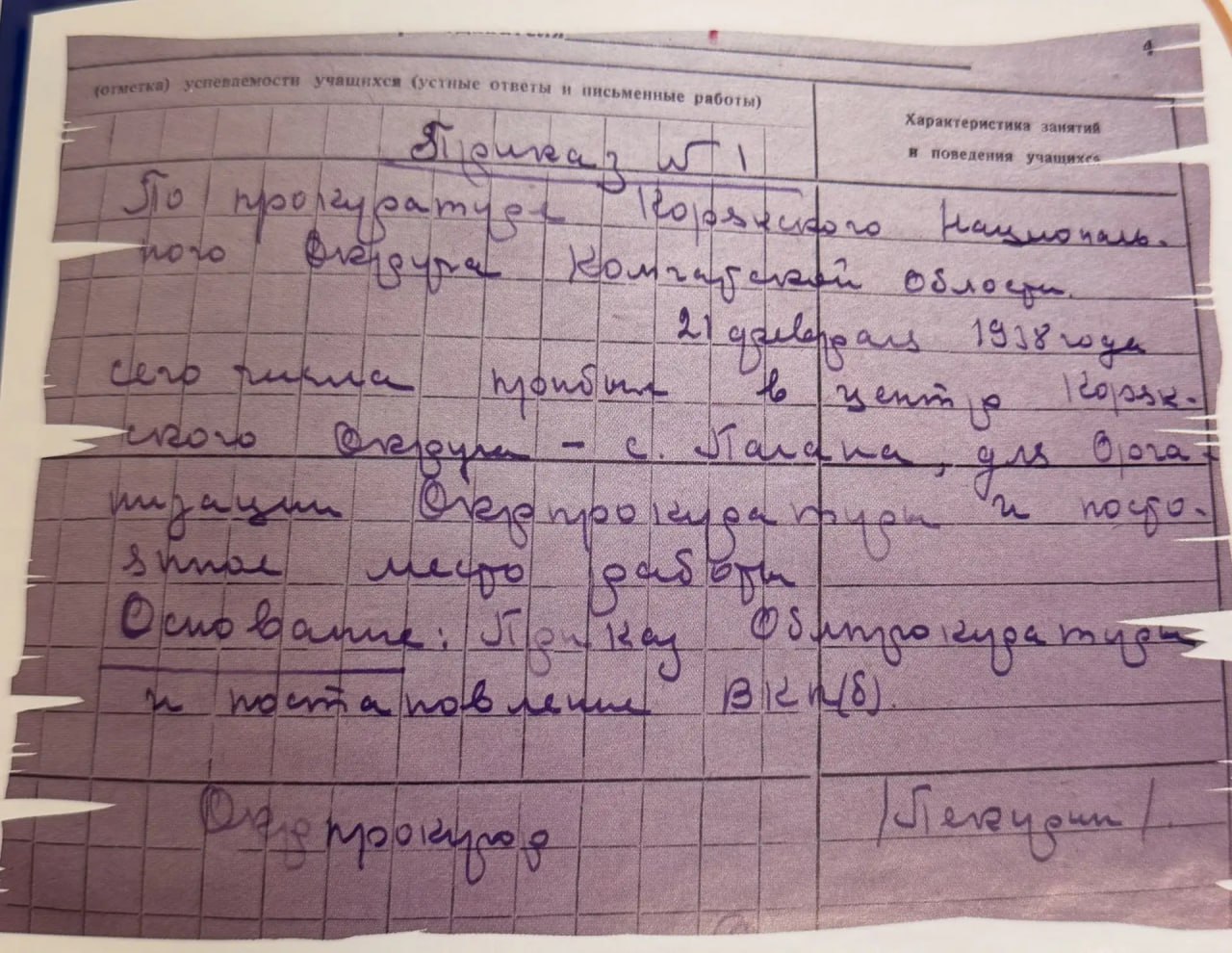 «Сего числа прибыл в центр Корякского округа — с. Палана для организации окрпрокуратуры и постоянного места работы. Окрпрокурор Пекурин».