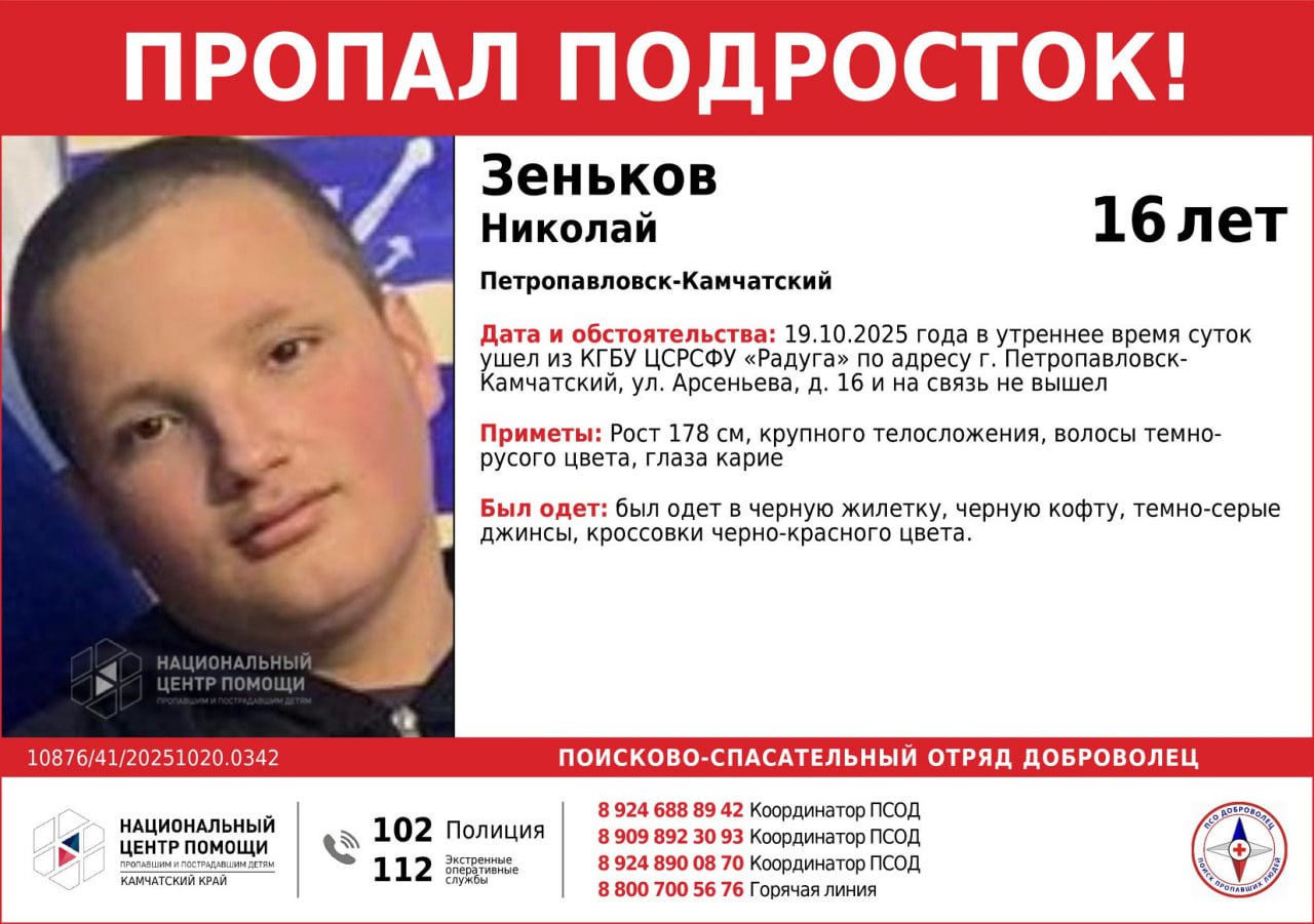 В Камчатской крае объявлен в розыск несовершеннолетний Николай Зеньков, который утром 19 октября ушел из Центра социальной реабилитации для несовершеннолетних «Радуга» и перестал выходить на связь.