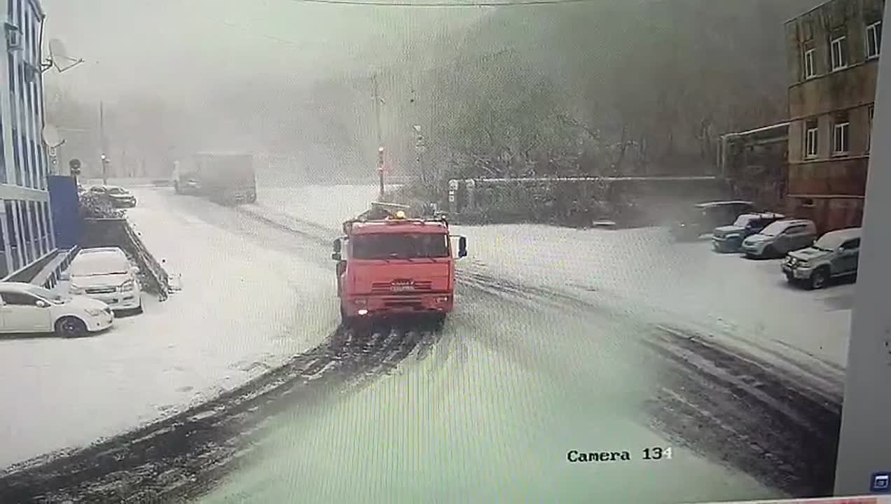 В районе Морпорта тягач не смог преодолеть подъём. Судя по видео, пострадали припаркованные автомобили.