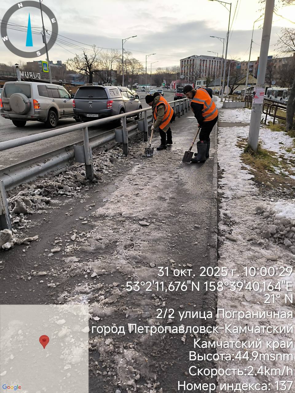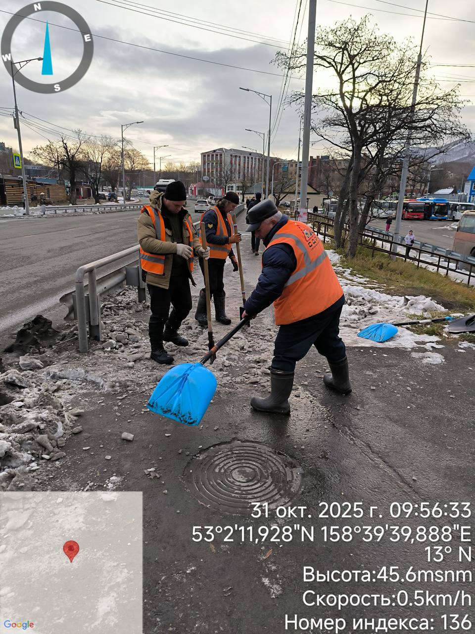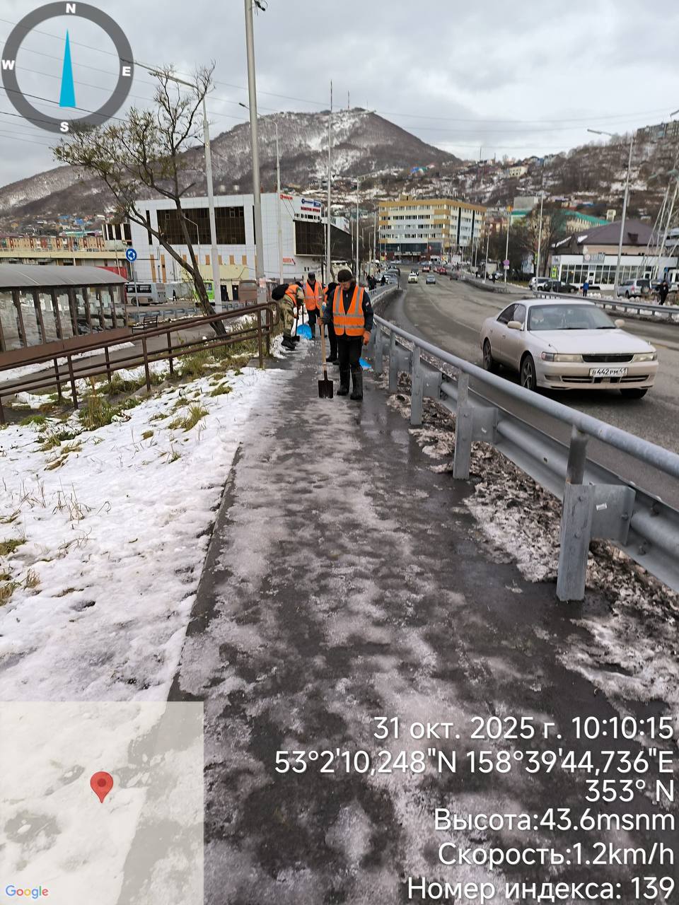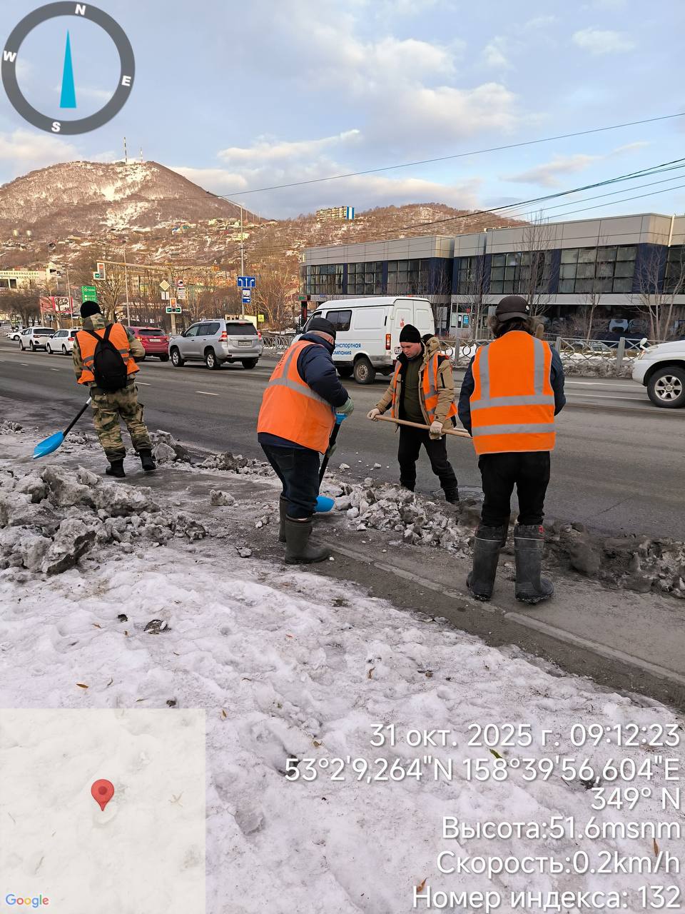 Бригады ручного труда продолжают работы по расчистке пешеходных зон.