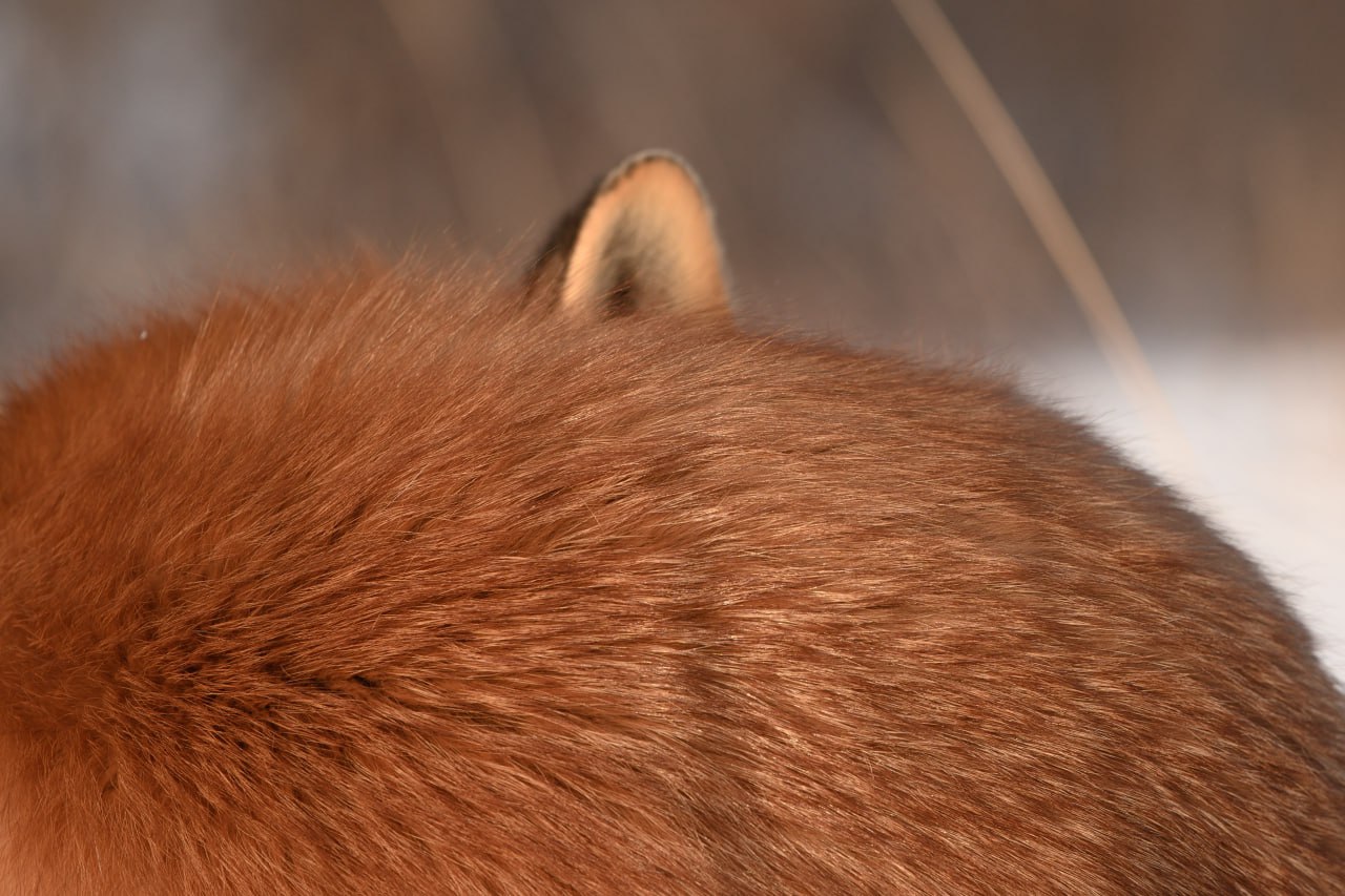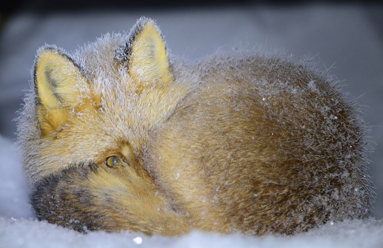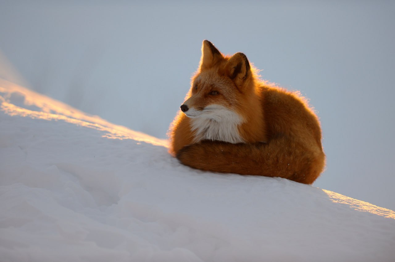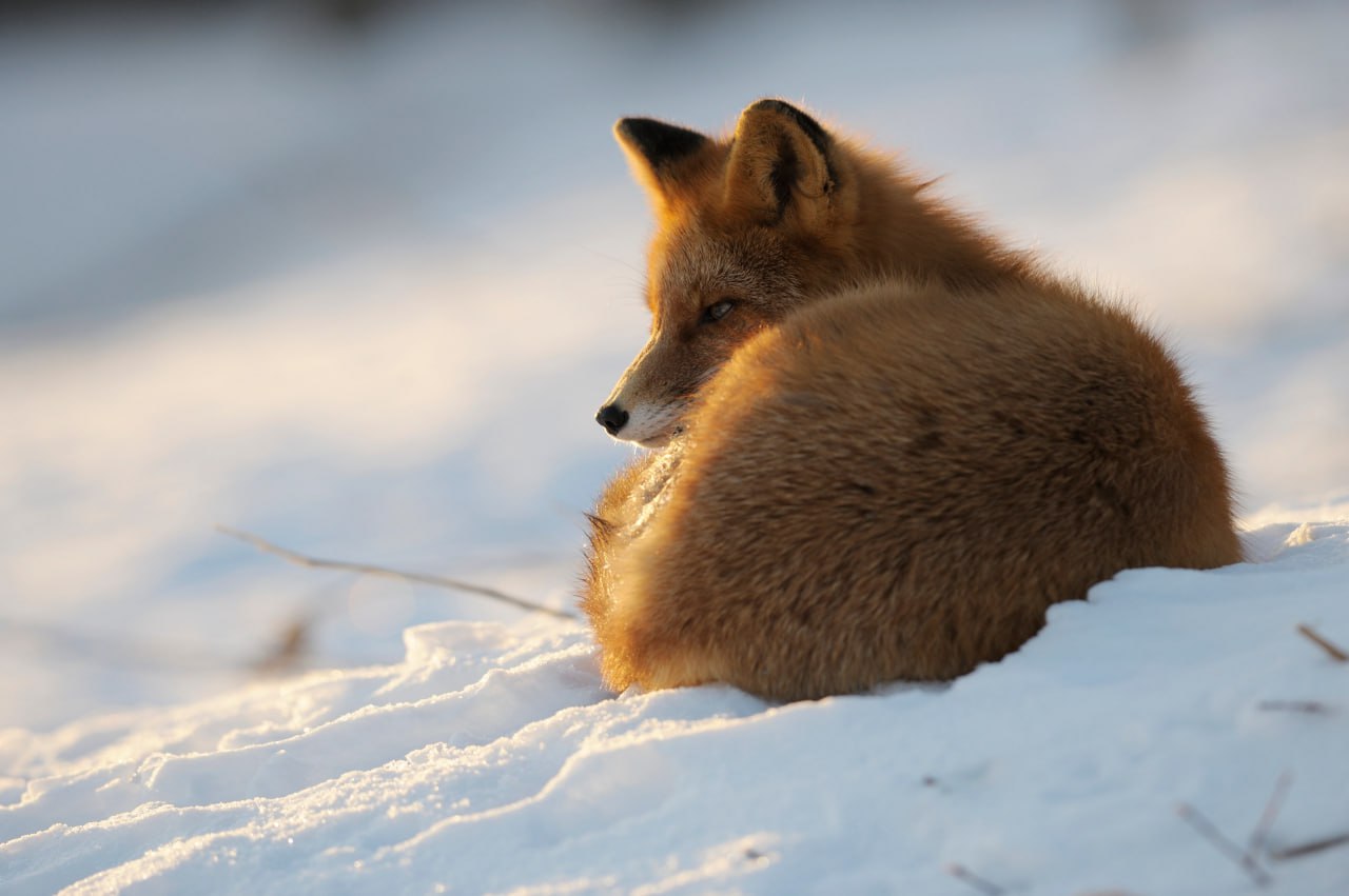 Камчатские лисички очень любят вот так сворачиваться, наблюдая за окрестностями, или дремать в таком положении.