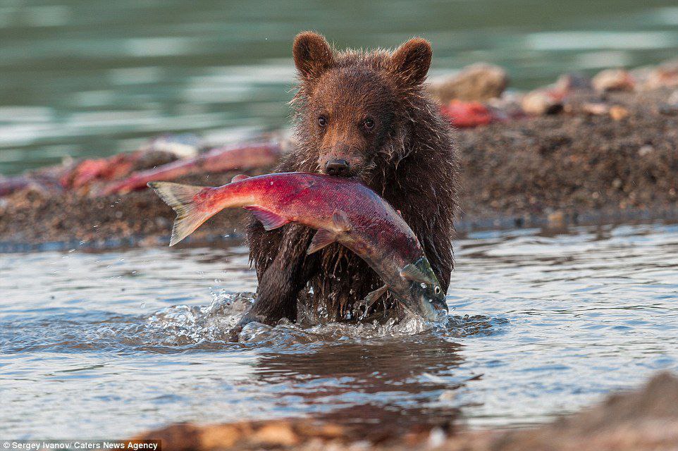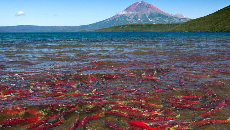 Курильское озеро: место крупнейшего нереста лосося в Евразии. Каждый год десятки тысяч лососей поднимаются вверх по реке, привлекая более 400 бурых медведей.