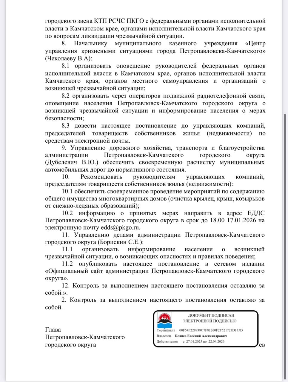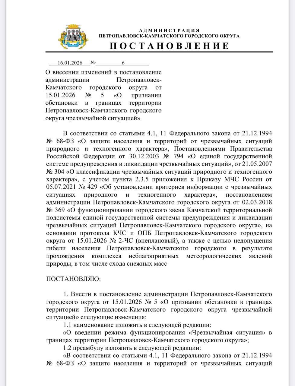Теперь точно ЧССегодня, 16 января, администрацией Петропавловска-Камчатского принято решение ввести режим функционирования «Чрезвычайная ситуация». Об этом сообщил глава города Евгений Беляев.По данным мэрии, несмотря на улучшение погодных...