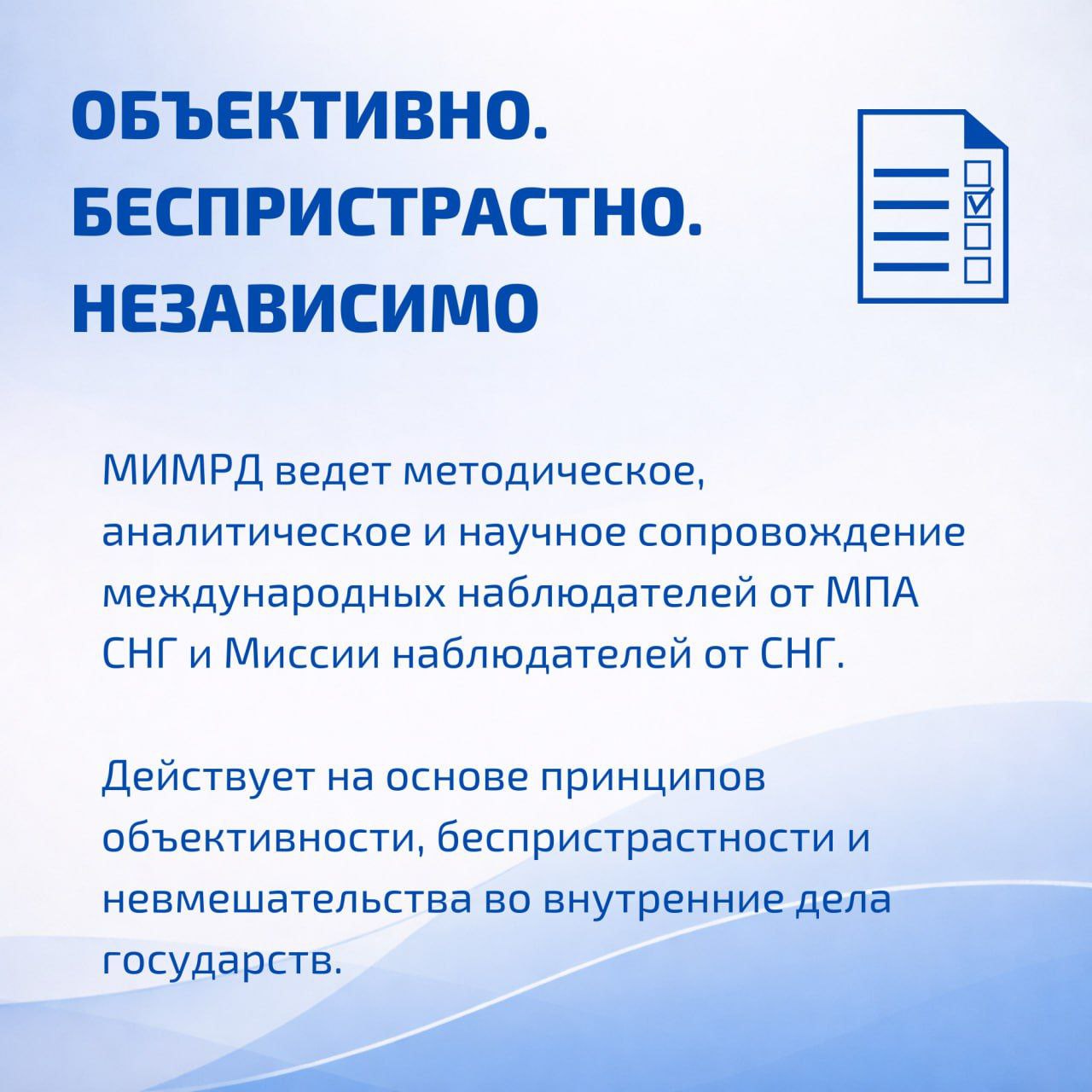 Институт работает на основе Конвенции о стандартах демократических выборов, избирательных прав и свобод в государствах — участниках СНГ.