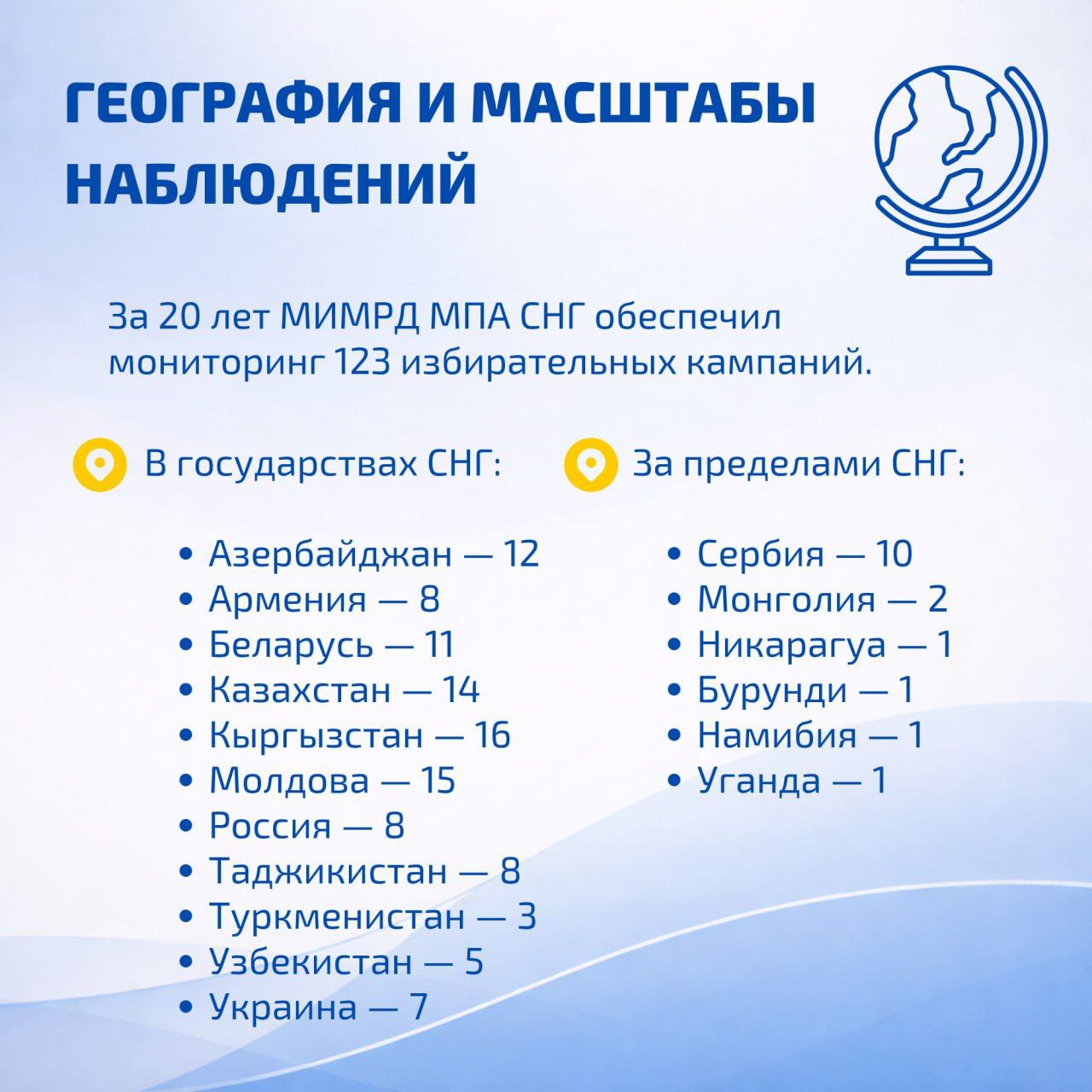 Институт разработал собственную методологию наблюдения и обеспечивает экспертное сопровождение деятельности международных наблюдателей от МПА СНГ.