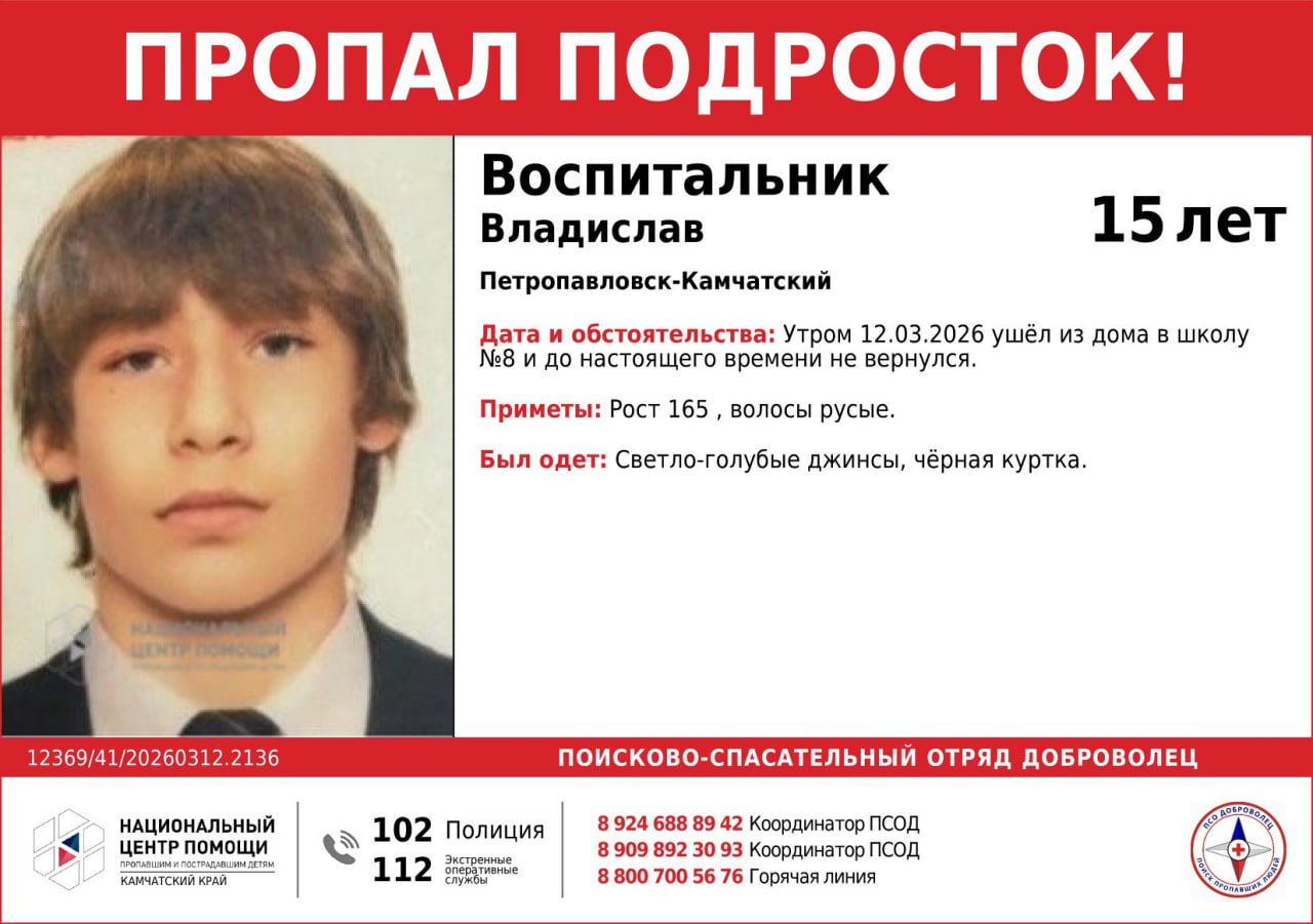 Разыскивается 15-летний Владислав Воспитальник: утром 12 марта он ушел из дома в школу № 8в Петропавловске-Камчатском и до настоящего времени не вернулся.