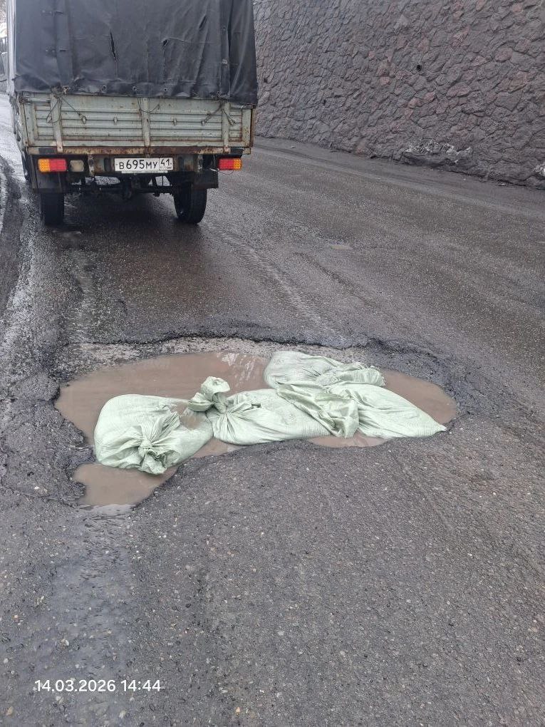 В Петропавловске на магистральных дорогах большие ямы заложили мешками с песком. Также опасные участки пометят дорожными знаками.
