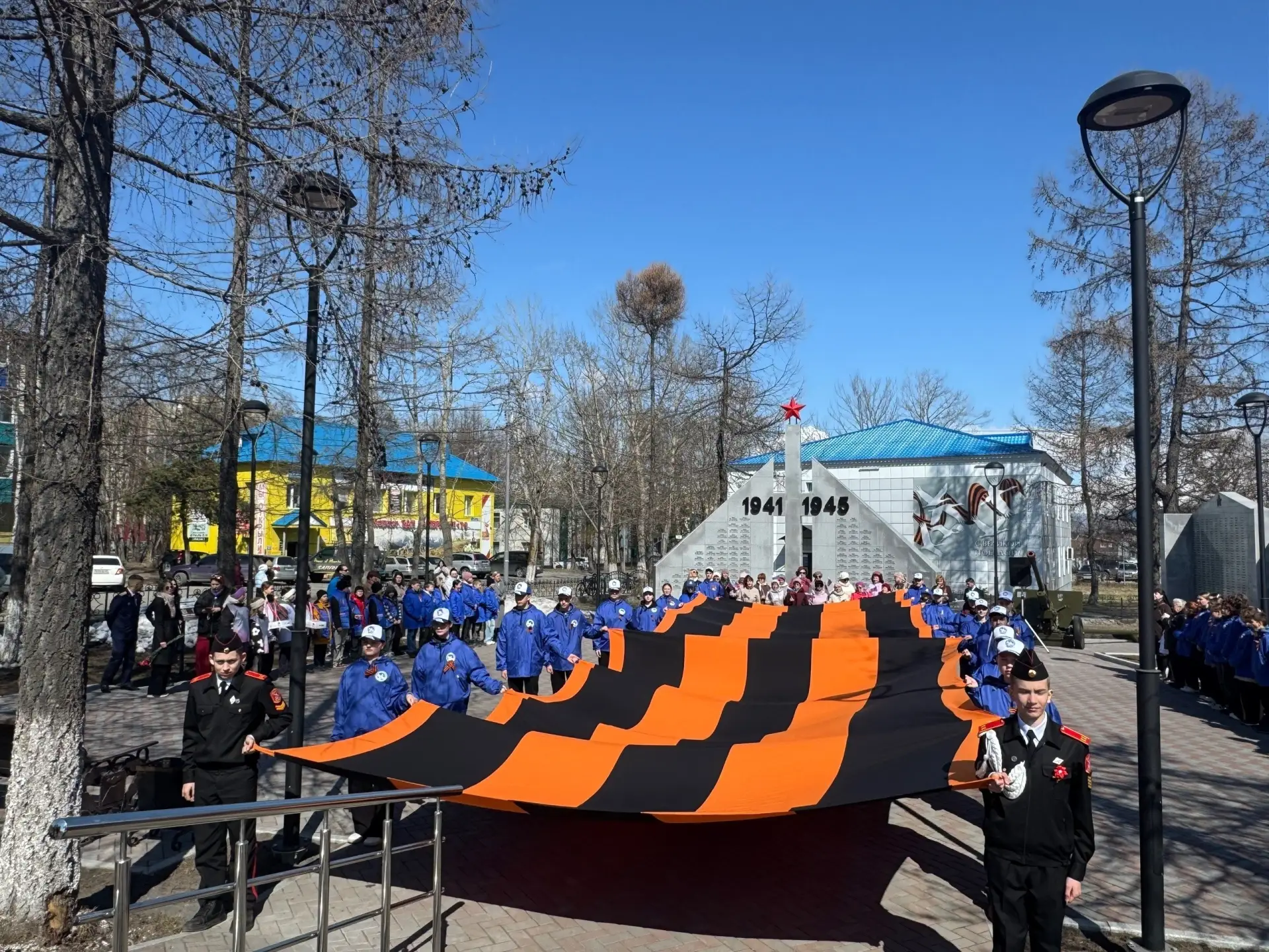 А в городе Елизово акция стартовала на территории обновлённого мемориального комплекса памяти участников Великой Отечественной войны. В ознаменование начала акции елизовские волонтёры развернули огромное полотно Георгиевской ленты.