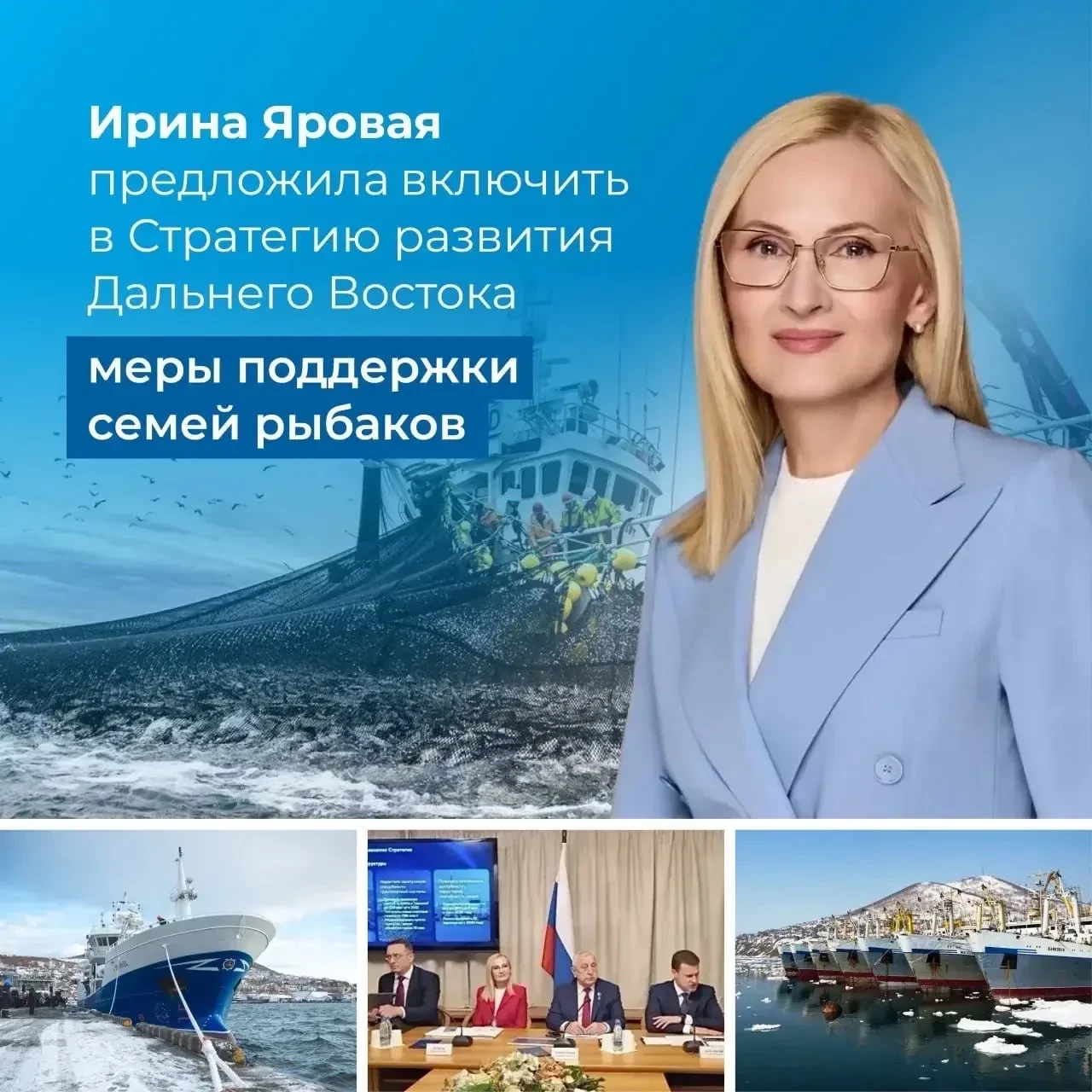 Заместитель председателя ГД РФ Ирина Яровая предложила включить меры поддержки семей рыбаков в Стратегию социальноэкономического развития Дальневосточного федерального округа до 2030 года — в частности, в разделе, посвящённом развитию Камчатского края. Об этом она заявила в ходе парламентских слушаний по проекту стратегического документа.