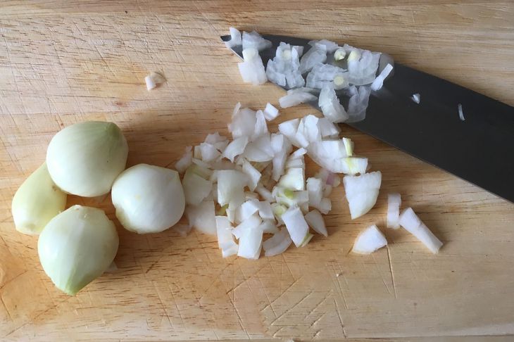 Для приготовления фаршированного лука возьмем луковицы среднего размера, очистим от шелухи, промоем, аккуратно достанем средину и мелко ее нарежем. Нарезанный лук слегка поджарим на разогретой сковородке с овощным бульоном. Куриную печень тщательно промоем и перекрутим через мясорубку в сыром виде.