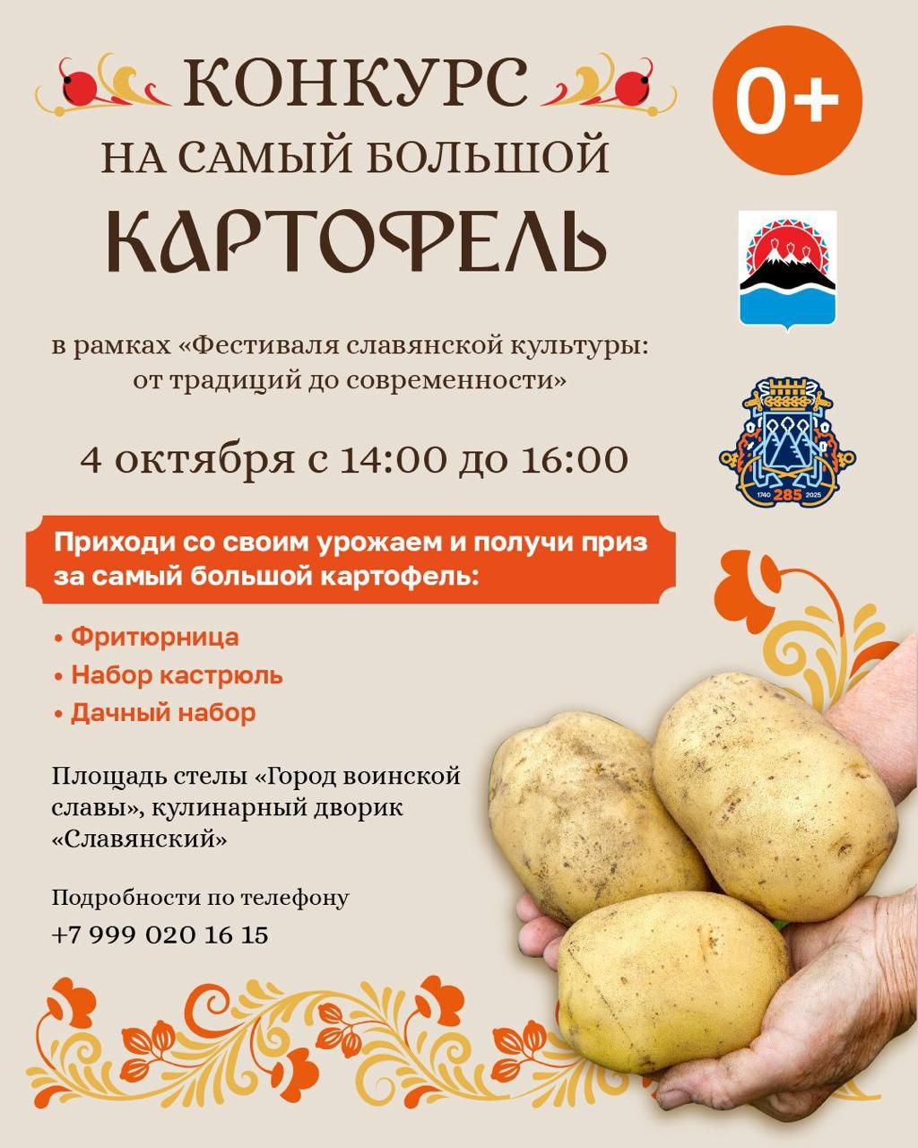 В 14:00 на площади у стелы «Город воинской славы» пройдет конкурс на самый большой картофель, поучаствовать смогут все желающие.