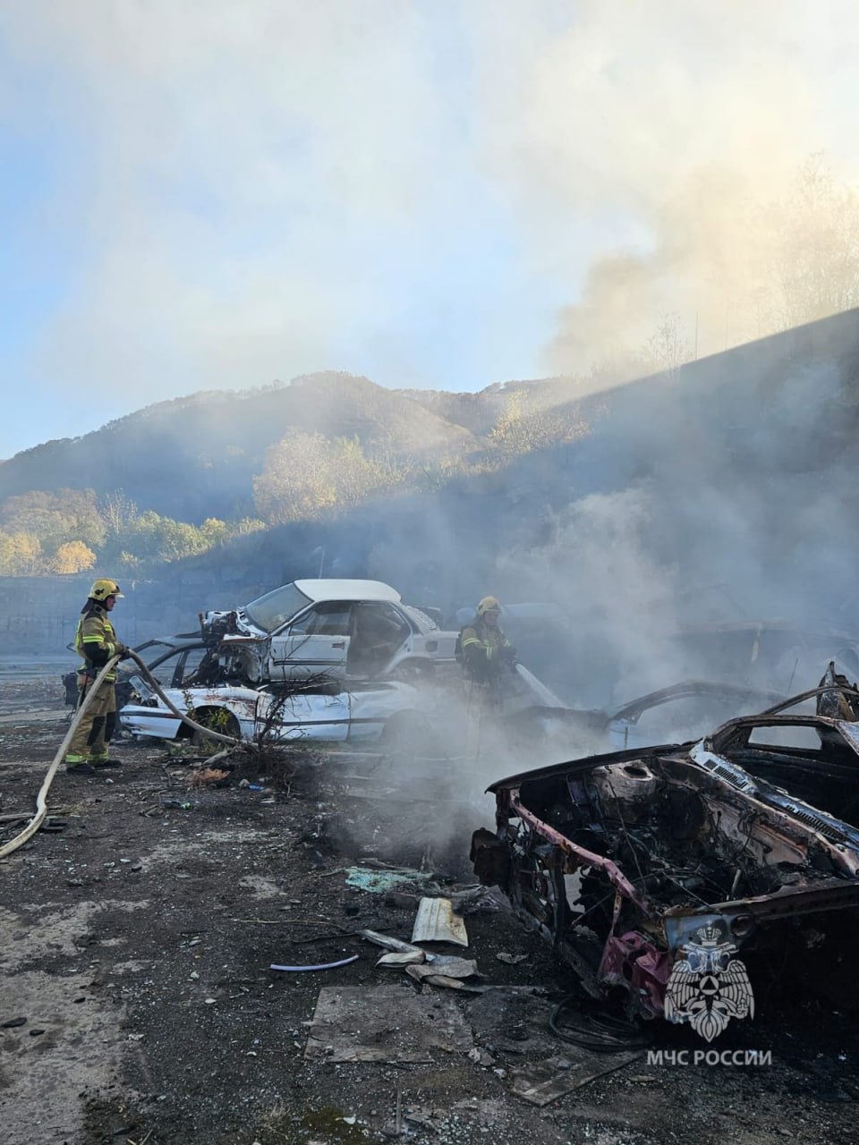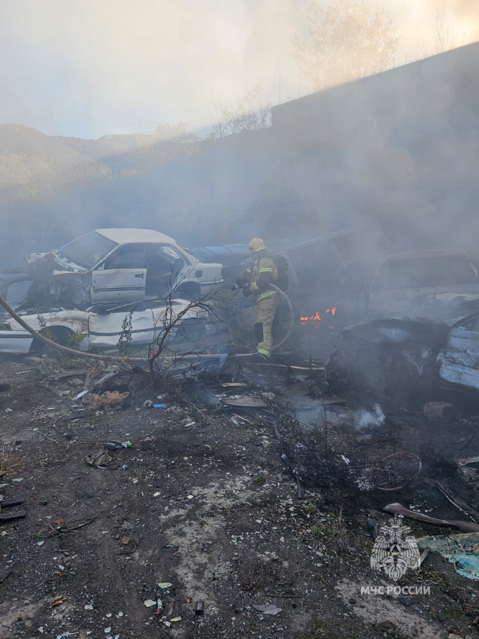 Горят заброшенные автомобили.