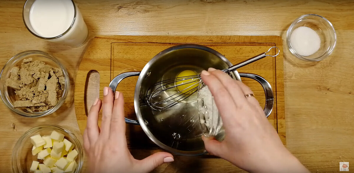 Для начала приготовим уникальный крем. В небольшой кастрюле следует взбить одно куриное яйцо с добавлением столовой ложки кукурузного крахмала (при желании можно использовать картофельный крахмал или даже немного муки). Далее, по вкусу добавьте столовую ложку сахара и постепенно влейте 300 мл молока, взбивая массу венчиком для обеспечения однородности и предотвращения образования комочков. Поставьте кастрюлю на средний огонь, активно помешивая смесь, сначала с высоким, а затем с низким нагревом, пока крем не загустеет. После этого закройте его пищевой пленкой «в контакт», чтобы избежать появления корки при остывании.