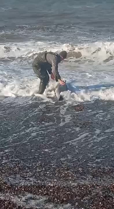 Он написал, что в годовщину эпопеи спасения косаток из лимана реки Большой Воровской Охотское море оставило на своем берегу симпатичного малыша - дельфина. И вновь на месте первый оказал животному помощь один из тех кто обнаружил и спасал косаток - Алексей Величко.