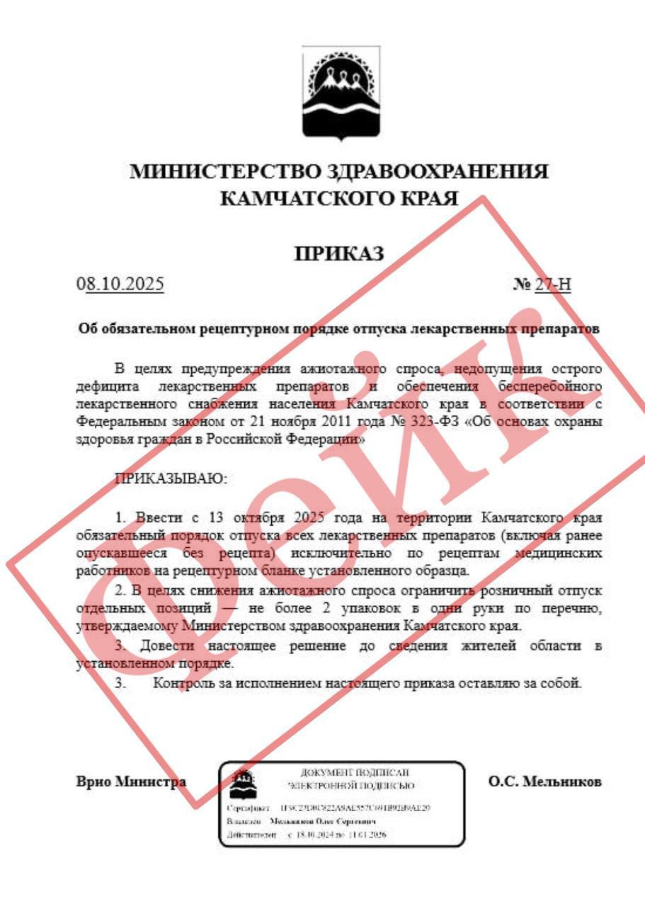 Минздрав опроверг информацию, распространяемую в сети неизвестными. Документ, якобы подписанный врио министра Олегом Мельниковым, утверждает, что на Камчатке введены ограничения на отпуск лекарств.