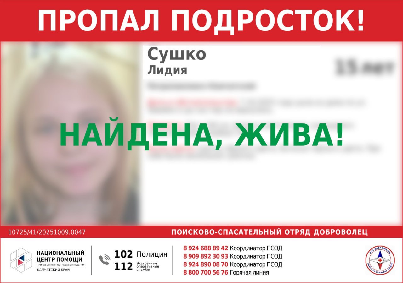 Волонтеры ПСО «Доброволец» сообщили о завершении поисков 15-летней Лидии С. Девушка пропала 7 октября, уйдя из дома по ул. Завойко.