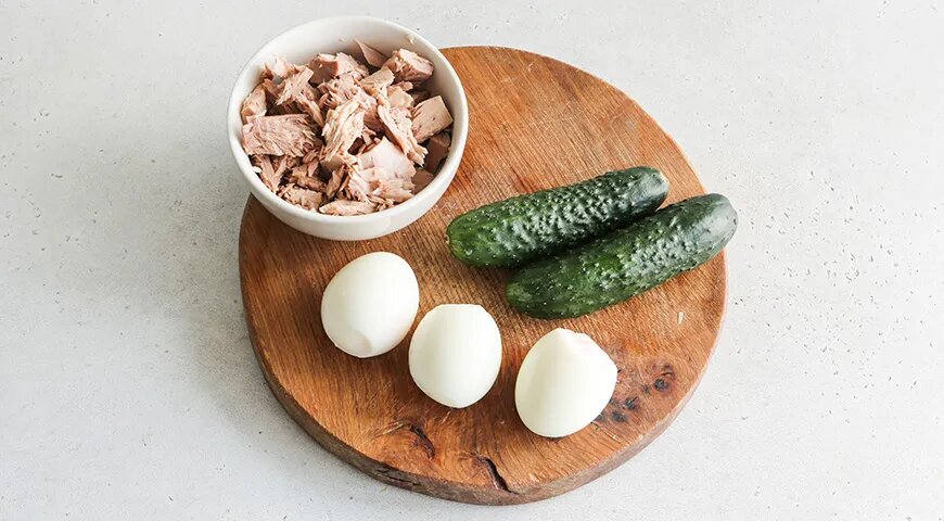 Чтобы создать этот аппетитный и сытный салат, сначала необходимо подготовить все ингредиенты. Яйца отварить вкрутую, охладить и очистить. Огурцы тщательно промыть: если кожура слишком жесткая, лучше её убрать. Консервированный тунец заранее слить от жидкости, чтобы избежать лишней влаги.