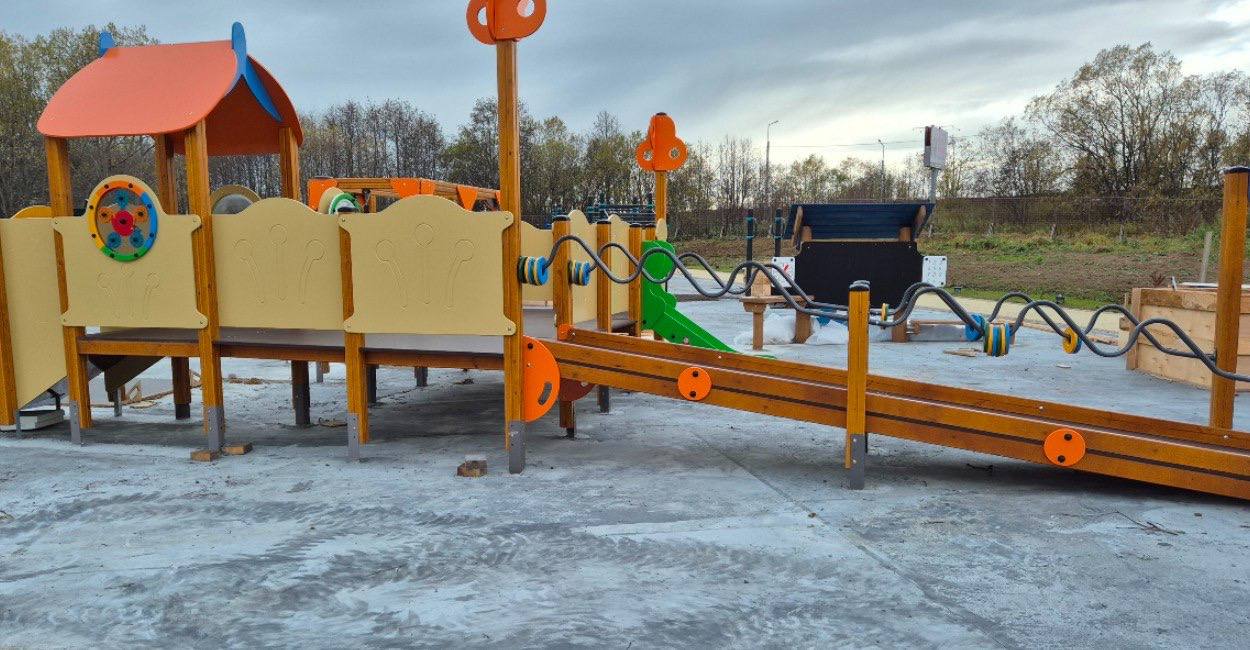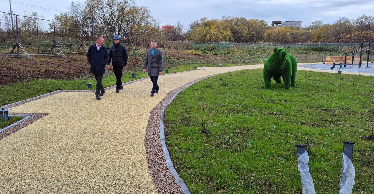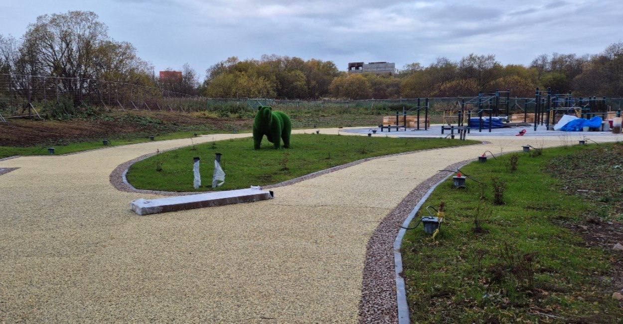 На территории уже есть спортивные тренажёры для маломобильных групп, детский игровой комплекс и арт-объект в виде медведя, который порадует детей.