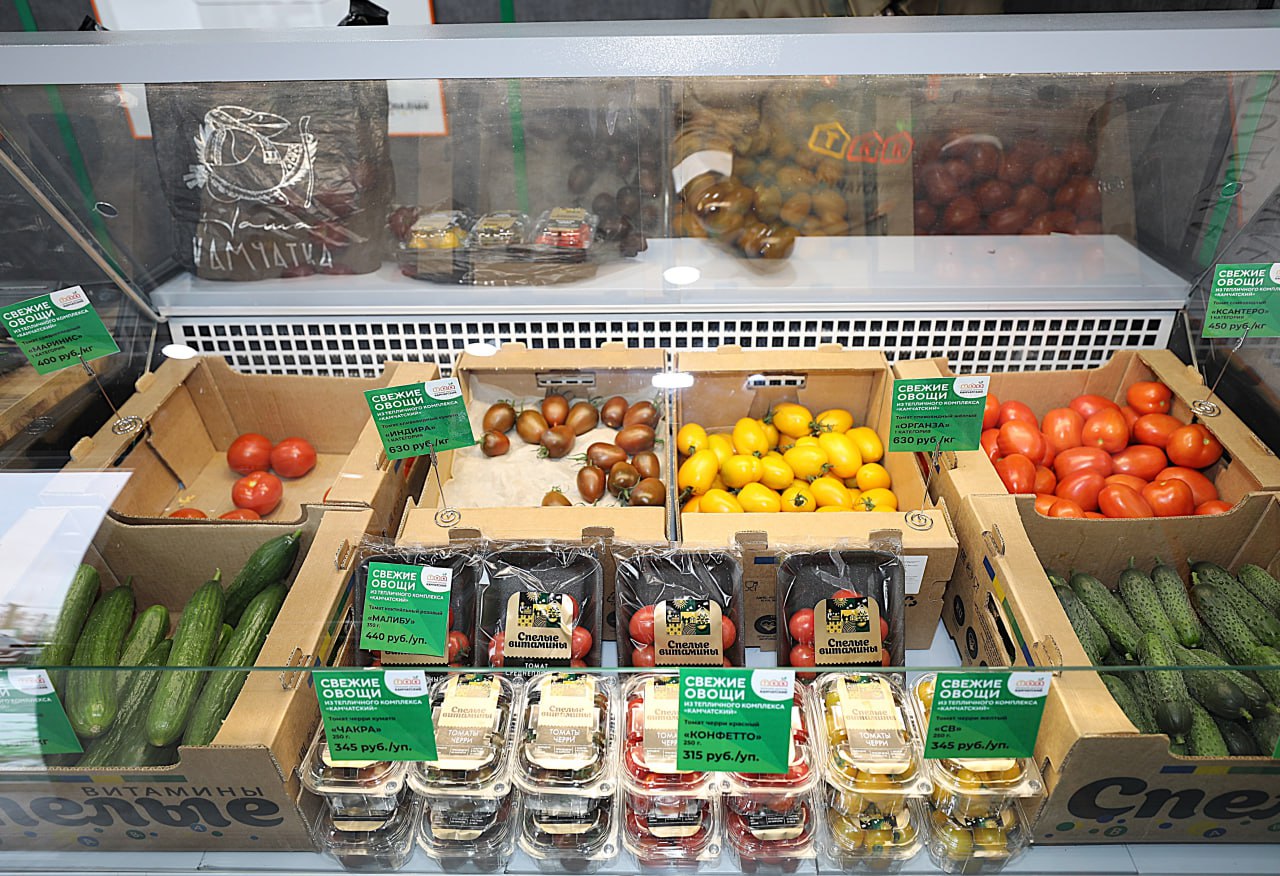 ТК «Камчатский» продолжает развитие. Одиннадцать видов свежайших овощей предлагал покупателям открытый при тепличном комплексе фирменный магазин «Спелый» в день встречи генерального директора Корпорации развития Камчатки Александра Мыльникова и его заместителя Александры Речкуновой с генеральным директором тепличного комплекса Ольгой Гвоздевой.
