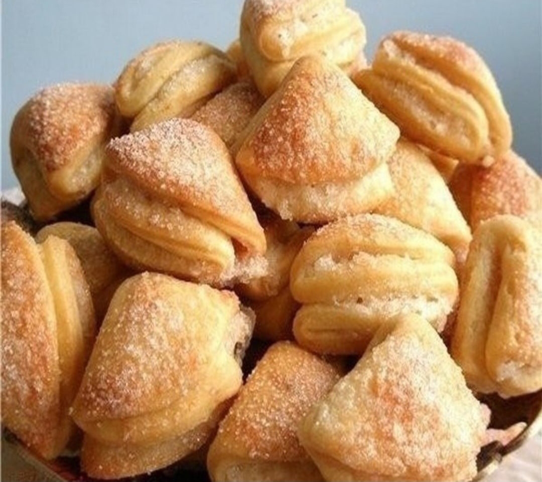 4. На плоскую поверхность насыпьте сахар. У каждого кружка творожного теста придайте форму, прижимая его к сахару, чтобы он прилипал ко всем сторонам. Сложите круг пополам, с сахаром внутрь, затем снова прижмите к сахарной поверхности и сложите треугольником.