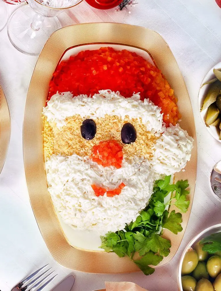 Теперь настало время для украшения. Для шапки можно использовать нарезанный кубиками свежий помидор или сладкий перец. Не забудьте оставить место для носа — это важный акцент вашего блюда! Будьте креативны и добавьте размельченное вареное яйцо, натёртое на крупной терке: белок равномерно распределите по салату, а желток используйте для отделения шапки и бороды.