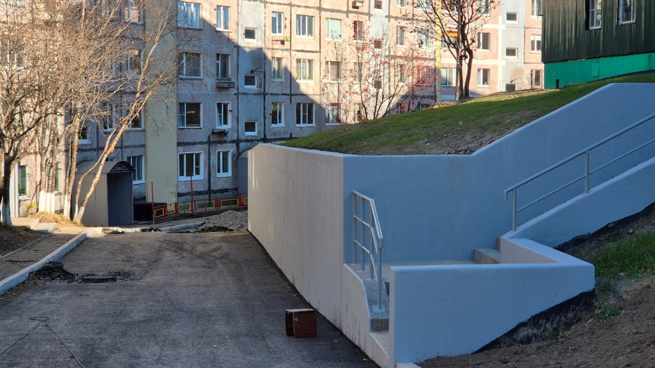 В рамках данного мероприятия была полностью заменена подпорная стена, сделана лестница между домами. В связи с тем, что инженерные коммуникации пришли в негодность, подрядчик провёл масштабную работу, заменив необходимые сети.