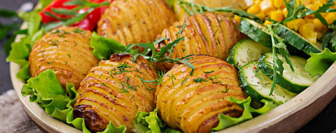 Пока картофель запекается, стоит промыть и подготовить листья зеленого салата, которые будут основой для подачи. Готовые картофельные вееры аккуратно выложить на салатные листья, а вокруг распределить консервированную кукурузу, дольки помидоров и огурцов. Завершить оформление свежей зеленью, подходящей к вашему вкусу, и не забудьте добавить еще немного масла для пущей сочности. Приятного аппетита!