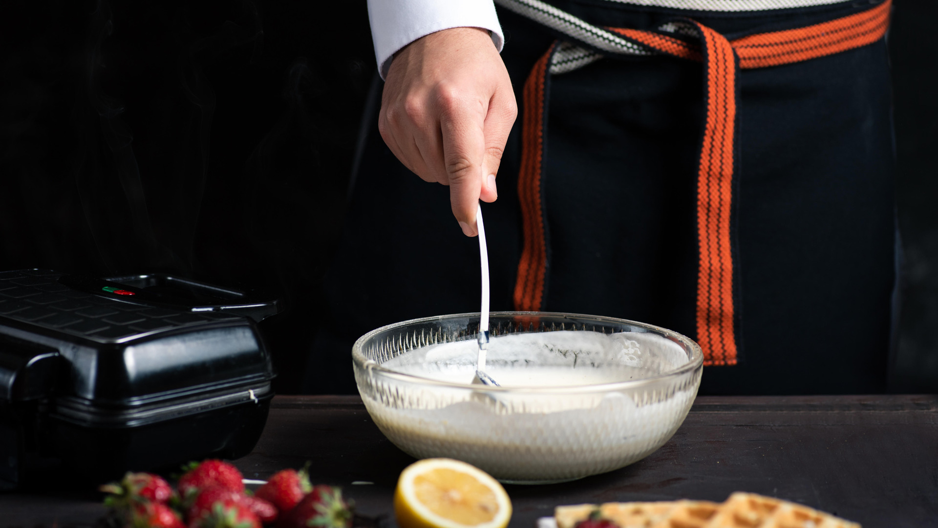 Сметану выложите в высокую емкость и добавьте к ней соль, сахар и половину муки. Все ингредиенты тщательно перемешайте венчиком. Затем добавьте к тесту яйца, и снова доведите до однородной консистенции. Только после этого засыпьте остатки муки и разрыхлитель.
