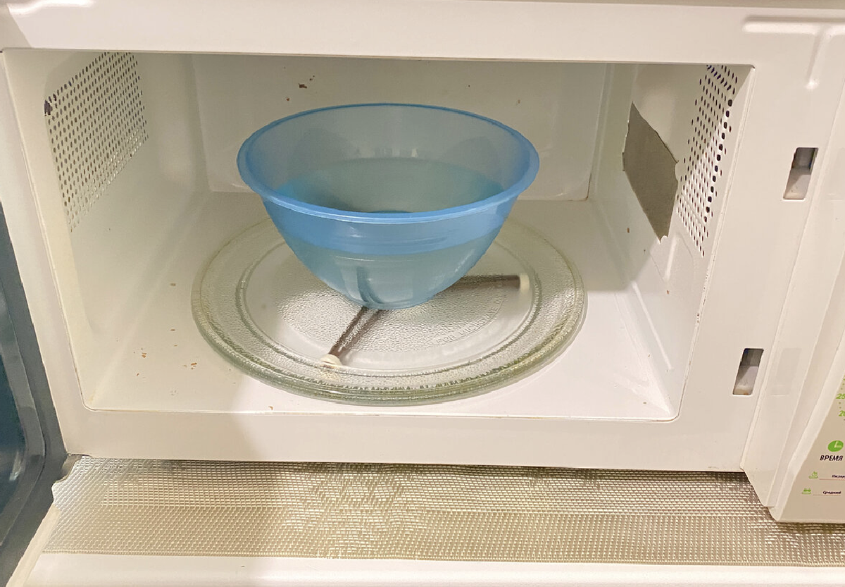 Поместите контейнер с полученным раствором внутрь микроволновки. Установите режим полной мощности и запустите устройство на пять минут. В результате пара, образовавшаяся во время нагревания, поможет размягчить все загрязнения внутри печи.