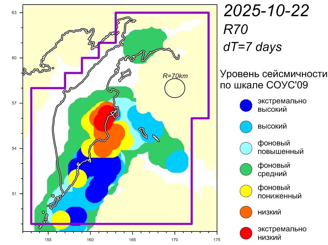 Уровень сейсмичности Камчатского участка зоны субдукции (по состоянию на 22 октября 2025 г.) – высокий по шкале СОУС'09. (http://emsd.ru/files/ku/ViS2011-SOUS.pdf).