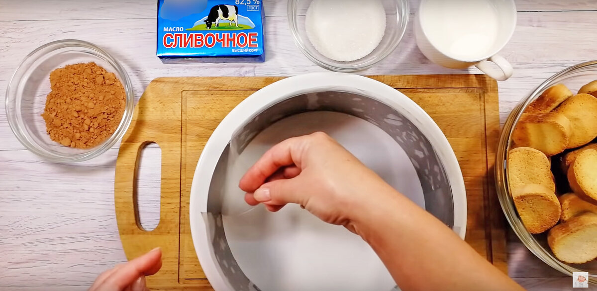 Сухари измельчают в крошку, после чего соединяют с шоколадной смесью и размягченным маслом, тщательно перемешивая. Полученную смесь укладывают в форму и утрамбовывают, оставляя в холодильнике на время подготовки крема.