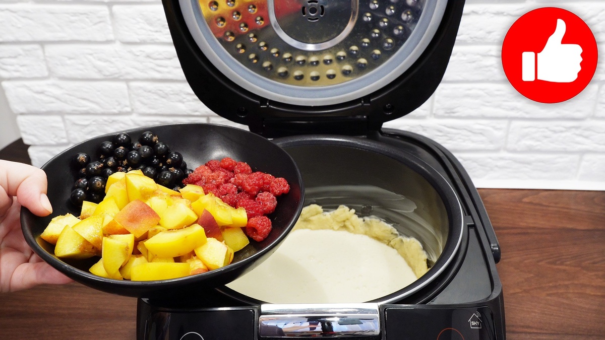 Когда тесто охладится, его нужно выкладывать в смазанную чашу мультиварки, аккуратно формируя бортики. В тесто вылить готовую творожную начинку, а сверху разместить нарезанные фрукты и ягоды. Готовить следует в режиме «Выпечка» в течение 60 минут. После завершения программы оставить пирог внутри мультиварки на 50 минут для остывания.