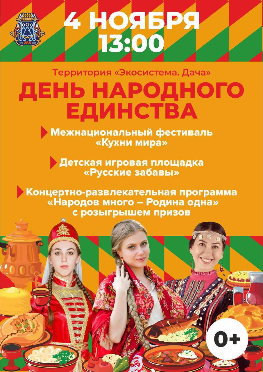 События развернутся на городской площадке «Экосистема. Дача», где с 13:00 до 14:00 часов пройдет официальная часть, затем начнется концертно-развлекательная программа «Народов много – Родина одна!», которая продлится до 16:00 часов.