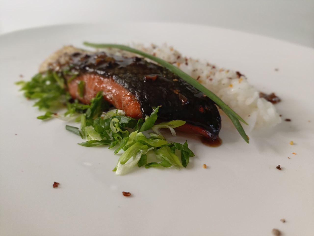 Шаг 8. Наливаем в масло соевый соус, уксус и жидкий мед. Загущаем до состояния карамели. Возвращаем лосось в сковородку и «купаем» в соусе несколько секунд. Наше блюдо готово.