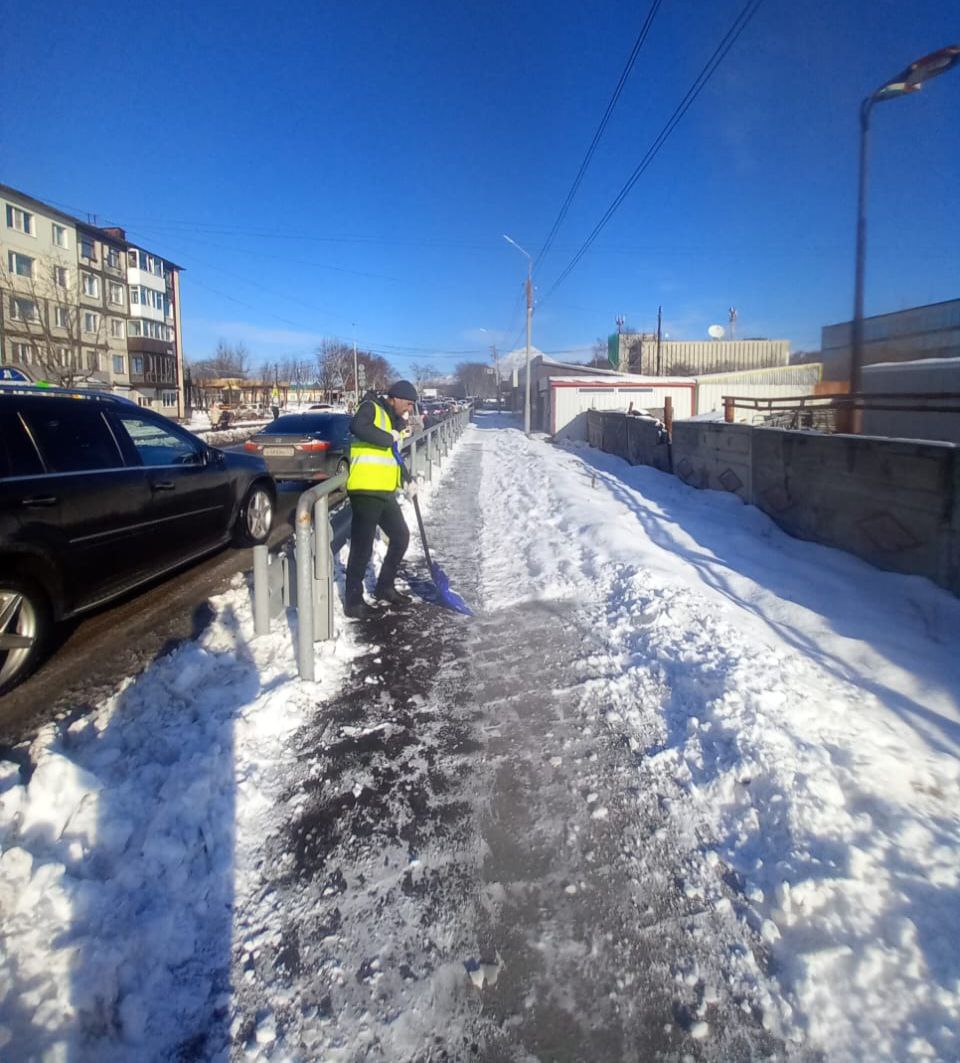 Подрядные организации проводят расчистку и обработку противогололедными материалами тротуаров и пешеходных зон.
