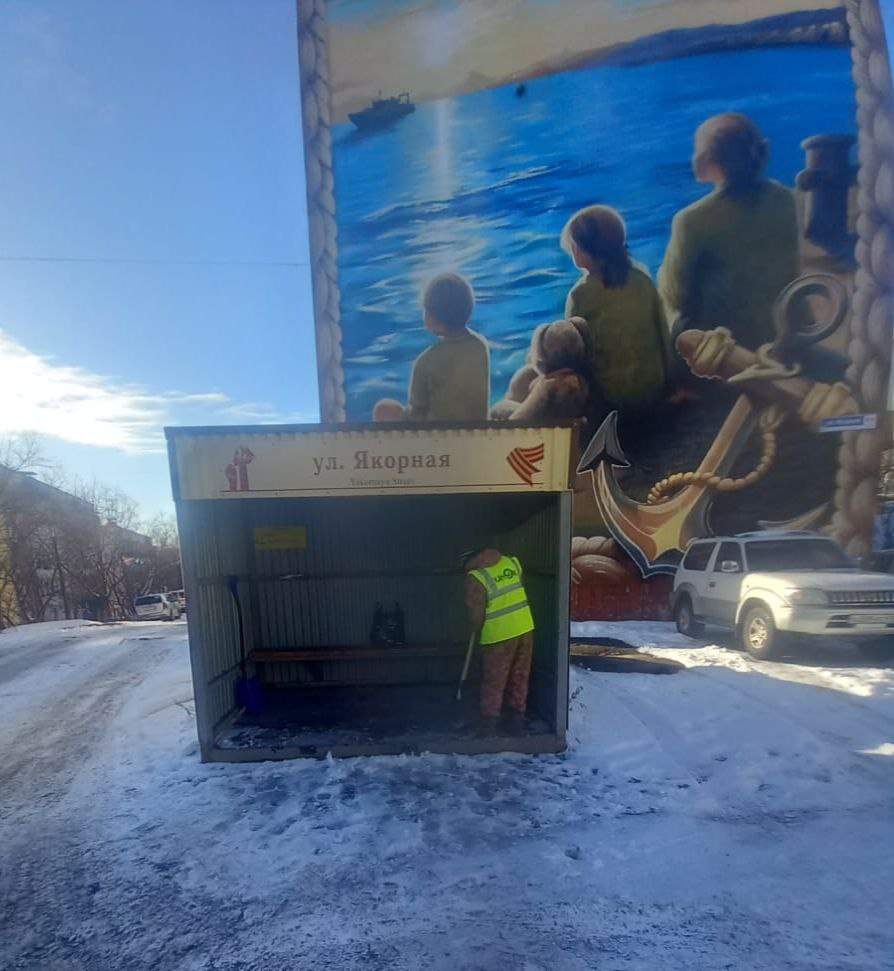 Проводят уборку остановочных павильнов и прилегающих территорий.