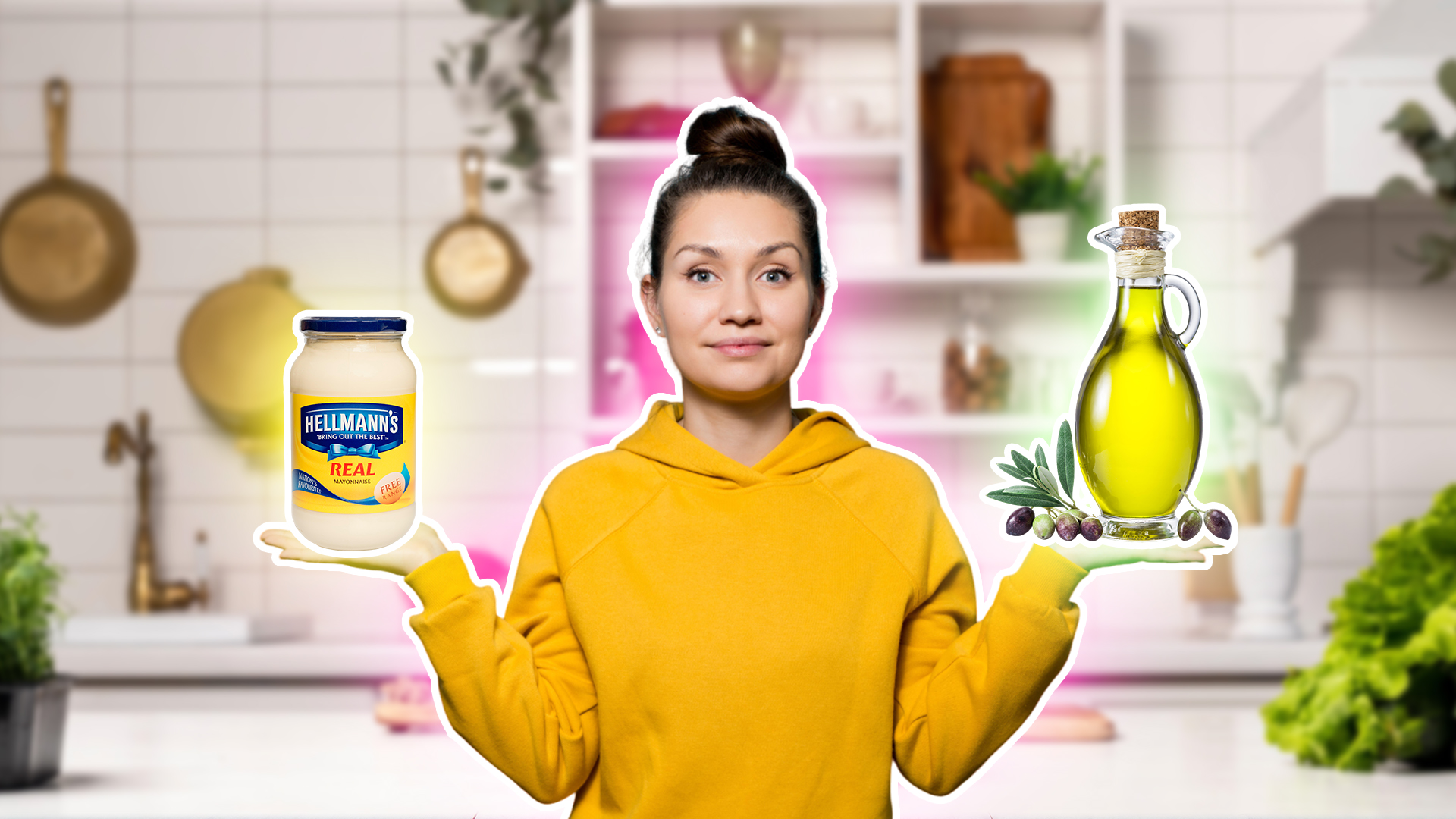 «Берете яйцо, горчицу, немного уксуса или лимонного сока. Заливаете масло и пробиваете все это блендером или венчиком. Оливковое масло — это 97% жира, а майонез — 67%.