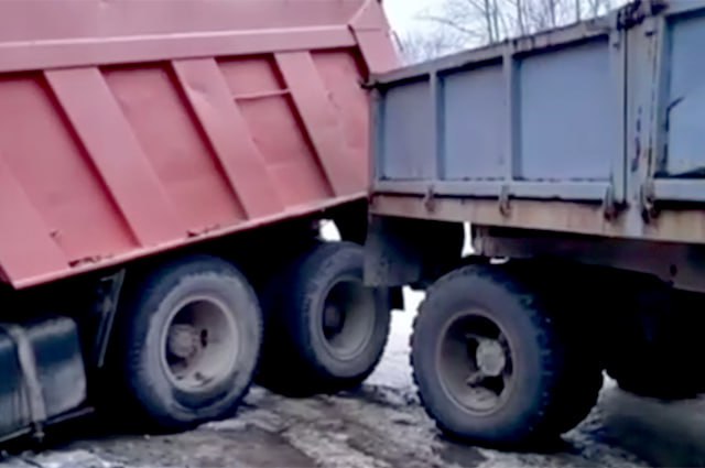 21 ноября на МТФ столкнулись два самосвала. По предварительной информации, груженный песком КамАЗ занесло на скользкой дороге.