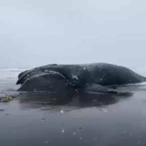 Официальная причина гибели пока неизвестна. Но на видео видно, что передняя часть головы животного запутана в сетях: одна веревка охватывает верхнюю челюсть и цепляется за ус, рядом лежит другая — возможно, продолжение первой.Обвитие рыболовными...