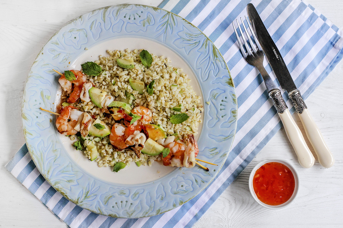 Шаг 6: Мяту мелко нарежьте и добавьте к булгуру. Перемешайте, сбрызните лимонным соком по вкусу. Подавайте шашлычки с табуле и сладким соусом чили.