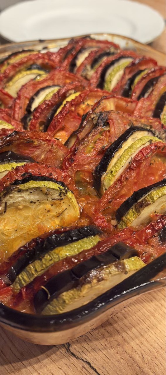 Третий акт — запекание. Форма с рататуем накрывается фольгой и отправляется в разогретую до 160°C духовку на час, после чего фольга убирается и запекается еще 20-30 минут до появления золотистой корочки.