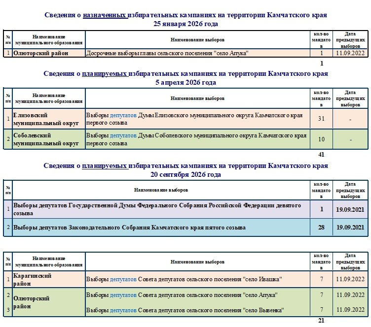 Единый день голосования в 2026 году пройдет 20 сентября. В этот день в Камчатском крае состоятся выборы депутатов Государственной Думы Федерального Собрания Российской Федерации девятого созыва, депутатов Законодательного Собрания Камчатского края пятого созыва и выборы депутатов в трех сельских поселениях.