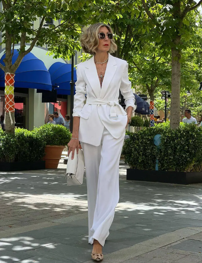 - Белоснежные ансамбли: Белый цвет не только визуально освежает, но и омолаживает. Брючный костюм белого цвета станет идеальным выбором для повседневных или деловых встреч. Свободные брюки и расклешенный пиджак подчеркнут фигуру и создадут изысканный образ.