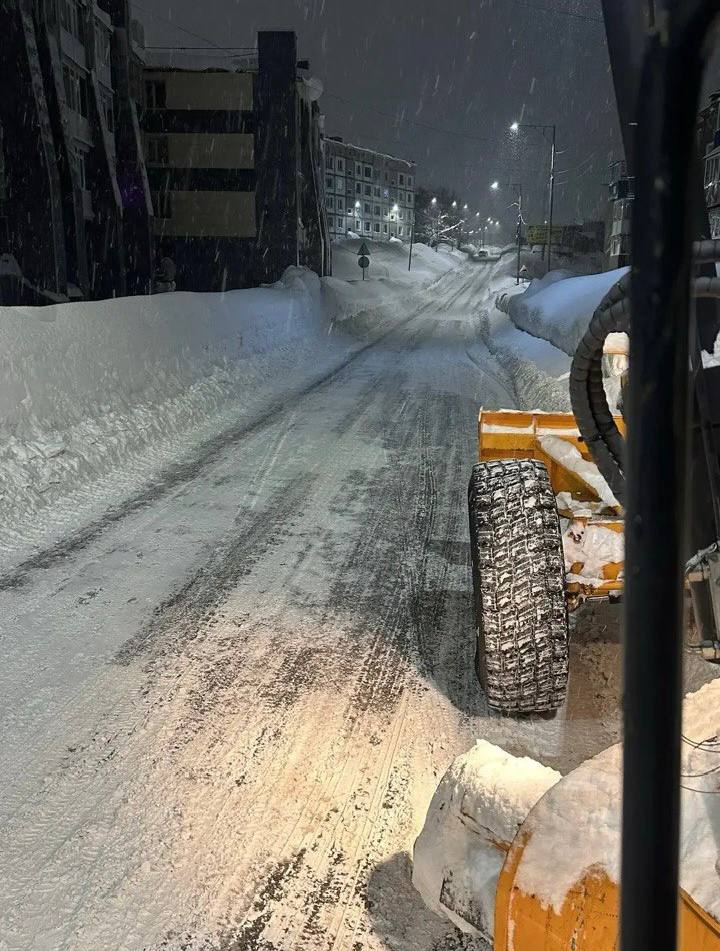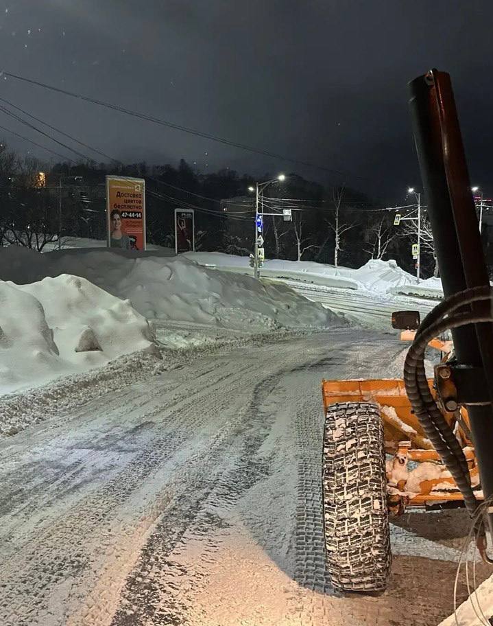 В ночную смену подрядные организации расчищали магистральные и внутриквартальные проезды.
