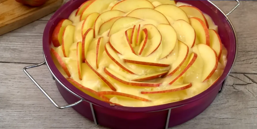 С помощью оставшихся яблок создайте красивое оформление: удалите сердцевину, нарежьте на тонкие ломтики и аккуратно вдавите их в тесто, формируя «роза» сверху.