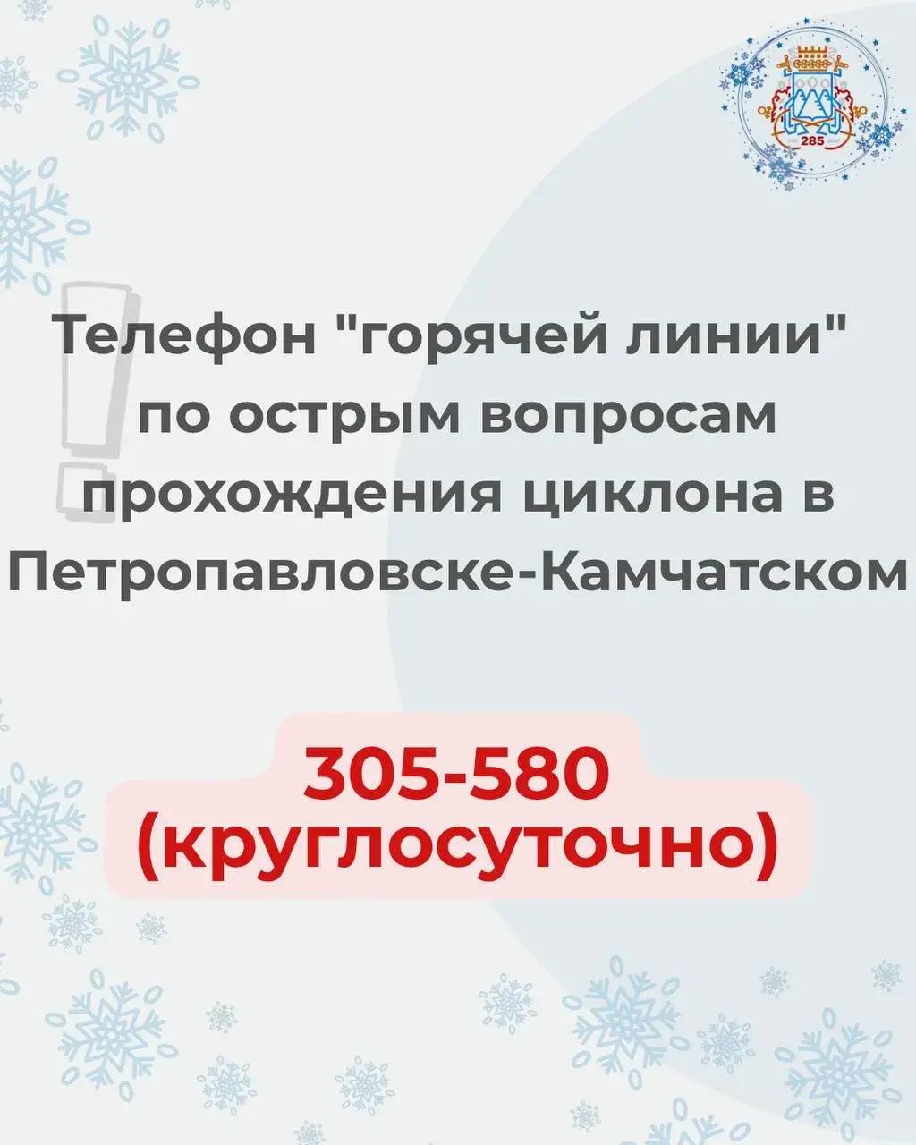 В Петропавловске-Камчатском открыт телефон «горячей линии» по вопросам прохождения циклона на территории городского округа: +7 (4152) 305-580 (круглосуточно)