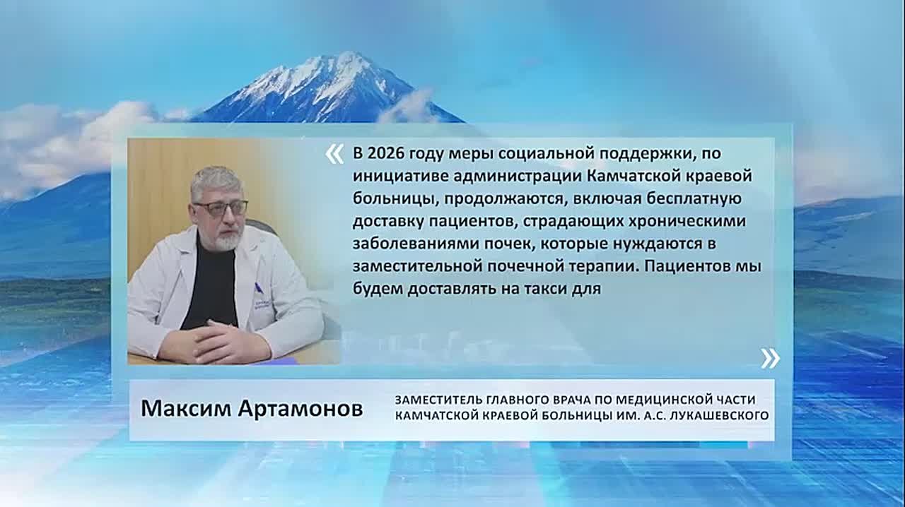 В 2026 году меры социальной поддержки, по инициативе администрации Камчатской краевой больницы, продолжаются, включая бесплатную доставку пациентов, страдающих хроническими заболеваниями почек, которые нуждаются в заместительной почечной терапии. Пациентов мы будем доставлять на такси для проведения им заместительной почечной терапии в отделении.