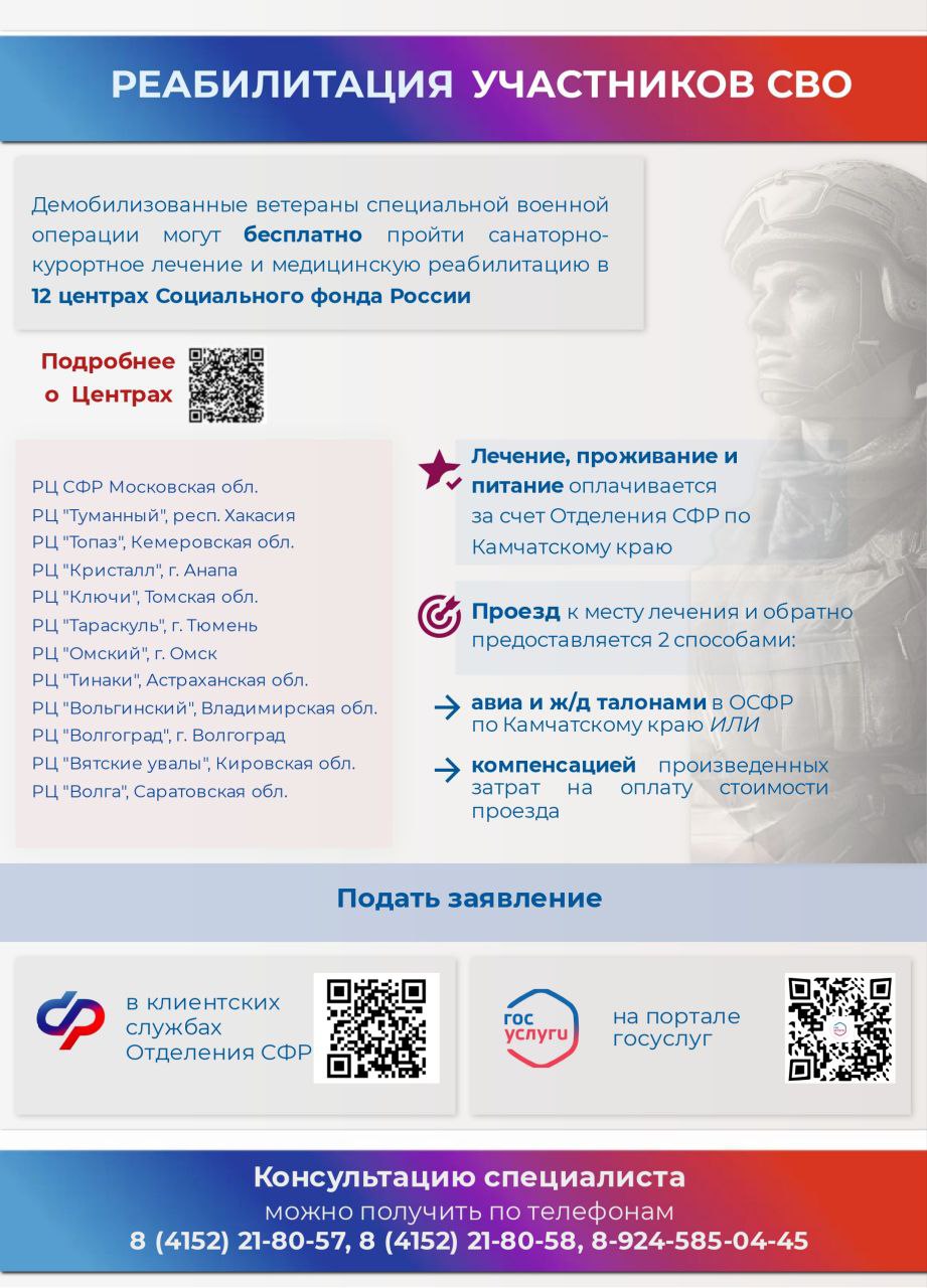 Для демобилизованных ветеранов в стране открыты 12 реабилитационных центров СФР, где можно пройти медицинскую реабилитацию длительностью до 25 дней или санаторно-курортное лечение продолжительностью до 21 дня. Лечение, проживание и питание полностью оплачиваются СФР. Помощь нашим ветеранам в восстановлении окажут высококвалифицированные специалисты на самом современном оборудовании.